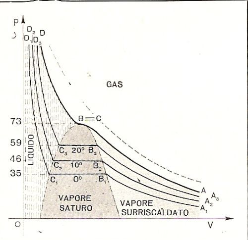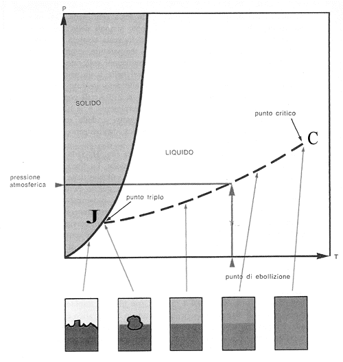 Il diagramma di Andrews pressione-temperatura per una data sostanza. Ricordo che J è il punto triplo, C è il punto critico e la linea tratteggiata è la linea della tensione di vapore (al di sotto di tale linea vi è il vapore della sostanza considerata.