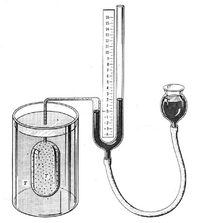 Un termometro a gas a volume costante tipo Amontons. Nel recipiente grande vi è la sostanza della quale si deve misurare la temperatura. Il bulbo che è dentro quel recipiente contiene aria ed è il sensore della temperatura. L’aria è in contatto con del mercurio, la cui variazione di altezza permette la misura della temperatura. In pratica si misura la temperatura attraverso variazioni di pressione (quella che l’aria esercita sul mercurio).