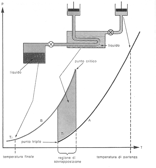 Siamo in un piano pressione-temperatura. Nello stesso piano sono qui riportati parte dei rami della tensione di vapore per due sostanze, la sostanza A e la sostanza B. La sostanza A, che può essere liquefatta con sola compressione a temperatura ambiente, la si può far evaporare ad una bassa temperatura T1 (la macchina disegnata in alto descrive i vari passaggi). La sostanza B, che ha un punto critico molto più basso della temperatura ambiente ma più alto della temperatura T1, può venire liquefatto per compressione fino a T1 e successivamente fatto evaporare ad una temperatura ancora più bassa T2. I due recipienti nella macchina disegnata in alto riportano, a destra, il primo gas liquefatto a temperatura T1 e, a sinistra, il secondo gas liquefatto a temperatura T2.