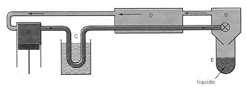 Riferendoci alla figura vediamo il funzionamento di una macchina di Linde (o Hampson). In A (recipiente di sinistra) viene compresso un gas che, dopo essere passato attraverso un condensatore C, arriva ad uno scambiatore di calore D e quindi al recipiente B dove subisce l’espansione attraverso un beccuccio. Abbiamo qui un leggero abbassamento di temperatura di modo che il gas che si espande, in D, raffredda quello in arrivo. In tal modo al beccuccio in B vi è un continuo raffreddamento finché non inizia la liquefazione del gas che si raccoglie in E. Il beccuccio ha così sostituito il motore ad espansione delle precedenti macchine con il grande risparmio e semplificazione di cui dicevo. Tali semplificazioni hanno però comportato da un lato il lavorare con pressioni più elevate e dall’altro avere maggiori quantità di gas, con la perdita totale in efficienza. Queste macchine iniziarono però l’ingresso delle basse temperature in numerosissimi processi industriali.
