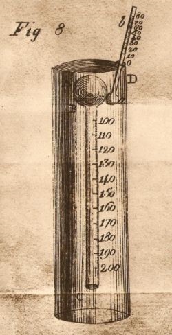 Su Volta c’è da aggiungere altro. Egli mise d’accordo i vari valori che da più parti venivano dati in modo discorde per il coefficiente di dilatazione termica dell’aria. Mostrò che, operando con aria secca, il disaccordo non esiste. Con accuratissimi esperimenti ed operando con un termometro ad aria (vedi figura seguente) trovò che l’aria aumenta di 1/270 del suo volume per ogni grado centigrado (il coefficiente α che tra poco troveremo nelle formule che ci forniscono le leggi dei gas, che oggi sappiamo valere circa 1/273 e che Clapeyron assumerà valere 1/267).
