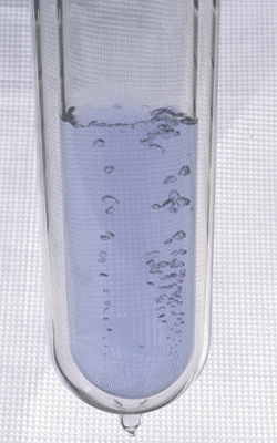 Ossigeno liquido in un vaso Dewar (la colorazione azzurrognola è caratteristica dell’ossigeno liquido).