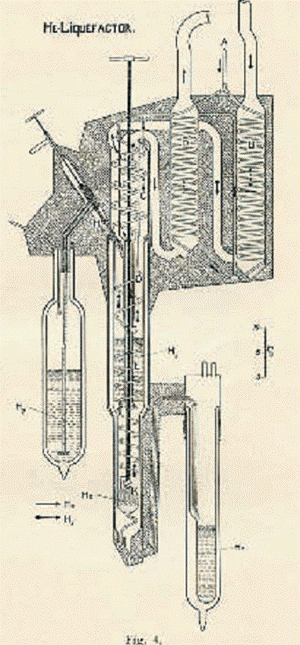 Immagine schematica del liquefattore dell’elio collegato ad un criostato per elio. L’idrogeno (H2) ha la funzione di preraffreddamento. Il gas elio (He) penetra nell’apparato in un circuito chiuso A, dopo di che passa attraverso le spirali del rigeneratore (nelle quali ritorna come gas preraffreddato il gas che viene immesso nel sistema), uscendo dalla valvola di espansione K (sulla quale si può operare dall’esterno con una lunga asta) per andare verso il sistema di raffreddamento mediante l’effetto Joule-Thomson. Questo ciclo si ripete più volte finché non si arriva alla liquefazione dell’elio che viene sifonato fuori, dentro un criostato separato in cui vi sono sia gli strumenti che le sostanze da studiare.
