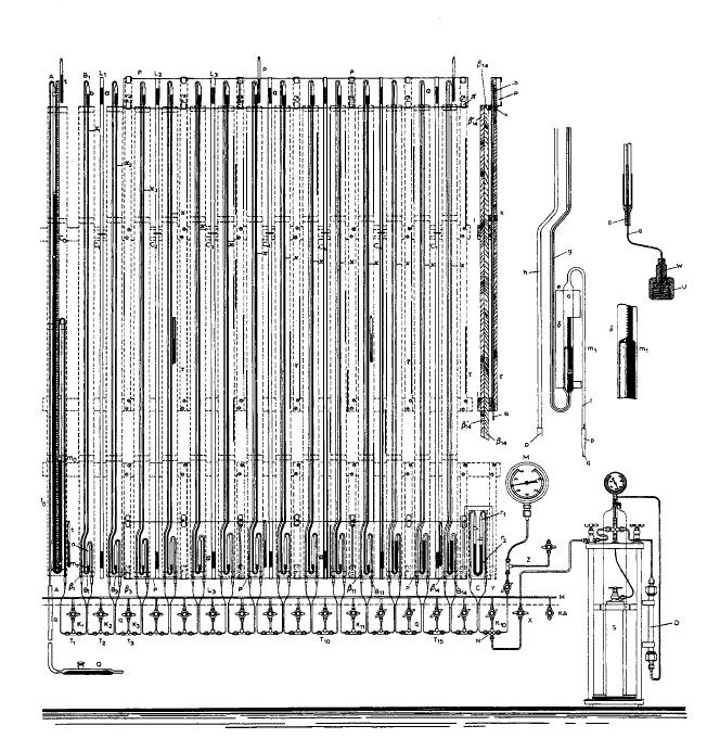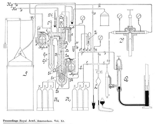 Uno schema che dà l’idea del manometro di cui disponeva Onnes. Si trattava della sistemazione di una serie di manometri differenziali montati in modo che la pressione da misurare passasse dall’uno all’altro e fosse garantita la migliore misura. In totale si aveva una colonna di mercurio di 45 metri. Dalla Nobel Lecture di Onnes.