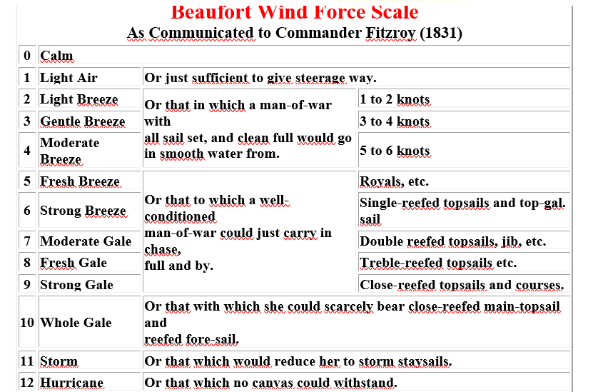 La Scala della forza dei venti di Beaufort così come fu comunicata al Comandante Fitzroy nel 1831