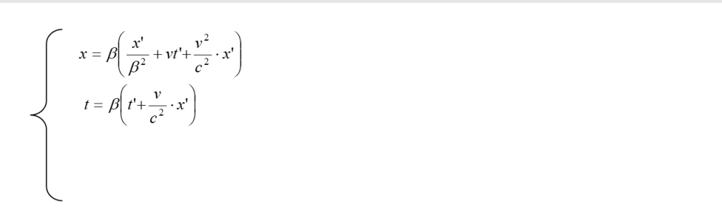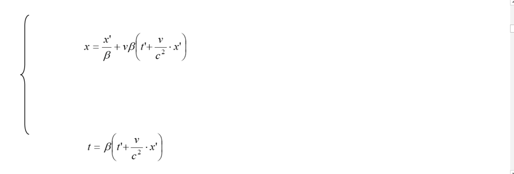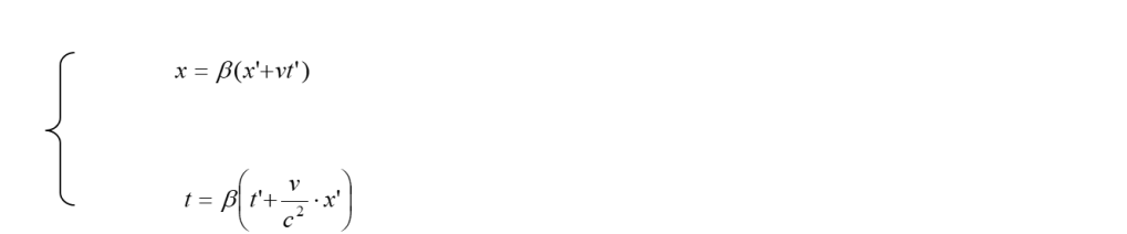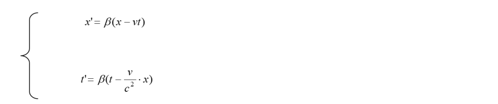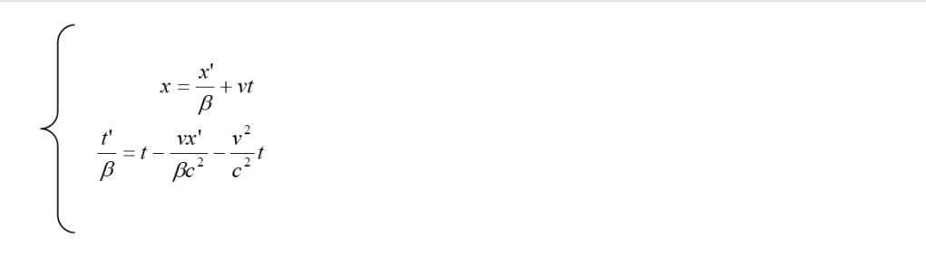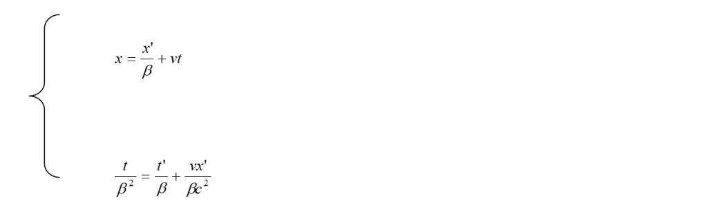 Ora, anche se Einstein non lo fa esplicitamente, è utile ricavare le trasformazioni inverse che rispondono alla domanda: quanto valgono le x, y, z, t di un evento rispetto ad S, quando sono date le grandezze x’, y’, z’, t’, dello stesso evento rispetto ad S’ ? Quanto detto corrisponde a situare l’osservatore in S’ e, dato il principio di relatività, supporre S’ in quiete mentre il sistema S si muove con velocità -v rispetto ad esso. Per rispondere alla domanda che ci siamo posti, osservando che già abbiamo ovviamente y = y’ e z = z’, basterà risolvere rispetto ad x e t il sistema formato dalla prima e dalla quarta delle (8). Risolvendo di seguito e, per semplicità, chiamando β = 1/(1 – v2/c2)½ , si trova, successivamente: