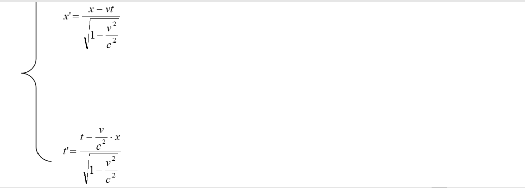 “è rappresentato rispetto al sistema di coordinate S dall’ascissa x e dal tempo t, e rispetto al sistema S’ dall’ascissa x’ e dal tempo t’. Dobbiamo trovare x’ e t’ quando siano dati x e t.” (862)