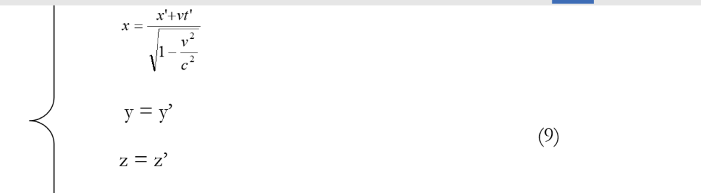 E’ di grande importanza osservare che le (9) si ottengono dalle (8) semplicemente sostituendo a v che compare in queste ultime la quantità – v. E ciò proprio in virtù del fatto che le trasformazioni che trova Einstein godono della proprietà di gruppo (la trasformazione inversa di una data trasformazione deve essere la trasformazione identica). (868)