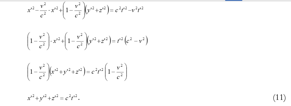 Se applicando le trasformazioni (9) a questa equazione otteniamo anche per il sistema S’ l’equazione di una superficie sferica che si propaga dall’origine O’ con velocità c, allora avremo dimostrato la compatibilità dei due principi di Einstein.o di seguito, si trova