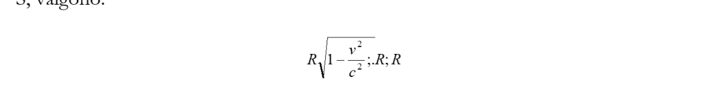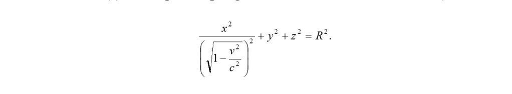 “un corpo solido, che misurato in stato di quiete ha la forma di una sfera, ha dunque in stato di moto – considerato dal sistema in quiete – la forma di un ellissoide di rotazione … Mentre dunque le dimensioni y e z della sfera (ma anche di qualsiasi altro corpo di qualsiasi forma) non appaiono modificate a cagione del moto, la dimensione x appare accorciata del rapporto (1 – v2/c2)-1/2, dunque tanto più fortemente quanto più grande è v. Per v = c tutti i corpi mossi – considerati dal sistema in quiete – si contraggono in figure superficiali. Per velocità superiori a quella della luce le nostre considerazioni perdono il loro significato; d’altronde vedremo nelle considerazioni che seguiranno che la velocità della luce ha, nella nostra teoria, fisicamente il ruolo di una velocità infinita. E’ chiaro che uguali risultati sussistono per un corpo fisso nel sistema in quiete quando venga considerato da un sistema in moto uniforme.”