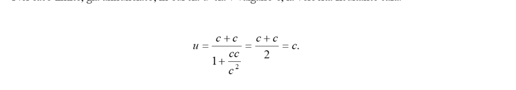Segue inoltre che la velocità della luce c non può venir modificata per composizioni con una velocità inferiore a quella della luce.”