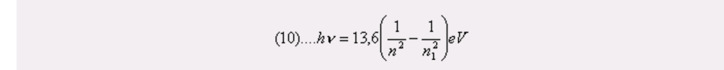 dove Ei è l’energia corrispondente all’orbita ad energia più alta, Ef quella corrispondente all’orbita ad energia più bassa ed hν è il quanto di luce che abbiamo incentrato nella prima teoria dei quanti di Planck. La relazione scritta significa che un elettrone nel passare da una certa orbita ad una ad energia più bassa perde energia, e questa perdita di energia (per la legge di conservazione) la si ritrova sotto forma di emissione di radiazione (emissione di un quanto di radiazione). Nel caso il salto avvenga in senso contrario a quello descritto fin qui si ha assorbimento di un quanto di radiazione hn dall’esterno. [Noto a parte che la prova sperimentale dell’esistenza degli stati quantici fu fornita da Franck ed Hertz nel 1913].