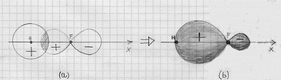 Poiché poi, elaborando le misure sperimentali,(6) si trova che k2 è maggiore di k1 e, che è lo stesso, k = k2 /k1 è maggiore di uno, ciò vorrà dire che il contributo relativo all’orbitale molecolare dell’orbitale atomico 2px è superiore al contributo relativo fornito dall’orbi tale atomico 1s. La ragione di ciò risiede nel fatto che i due orbitali atomici che si uniscono per formare l’orbitale molecolare hanno energie diverse risultando, in questo caso, superiore l’energia del 2px del fluoro di quella dell’orbitale 1s dell’idrogeno. Ed in definitiva, a seguito del fatto che k2 > k1 , i due elettroni che prendono parte al legame tenderanno a trovarsi per la maggior parte del loro tempo più vicini al nucleo del fluoro (la densità di carica della nube elettronica sarà maggiore vicino al fluoro che non all’idrogeno) che fornisce un orbitale di valenza più stabile di quello fornito dall’idrogeno. Ciò si può anche dire affermando che l’atomo di fluoro è più elettronegativo(7) di quello dell’idrogeno. I due coefficienti k1 e k2 , legati da k = k2 /k1 , sono quindi molto importanti poiché, in definitiva, si forniscono il grado di polarità di una molecola (la molecola avrà un carattere ionico parziale).