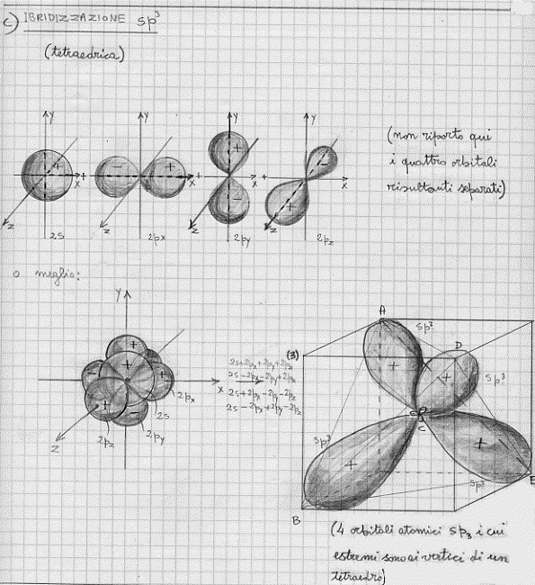 Per quel che riguarda il carbonio e per rendere conto della sua tetravalenza, si deve assumere che avvenga un mescolamento tra un orbitale s e tre orbitali p: da queste mescolamento si originano quattro nuovi orbitali atomici che, con ovvio significato dei simboli, sono chiamati ibridi sp3 (tutti perfettamente equivalenti).