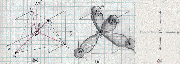 C’è da notare che gli angoli a tra ogni coppia di assi unenti il nucleo del carbonio con i nuclei di idrogeno (figura 22a), sono tutti uguali e valgono 109° 28′, in perfetto accordo con le misure sperimentali eseguite con metodi spettroscopici.