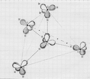 Figura 25 – I lobuli ombreggiati sono quelli che contengono coppie di elettroni leganti; gli altri contengono coppie solitarie. Le linee tratteggiate rappresentano il legame idrogeno. Le linee continue e quella tratto-punteggiata descrivono il tetraedro ai cui vertici si incontrane le quattro molecole di acqua che circondano la molecola centrale.