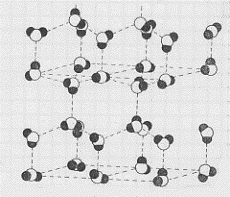 (16) Le forme cristalline in cui può esistere il ghiaccio sono diverse (come hanno mostrato studi condotti sotto la direzione di Bridgmann e lavori di Lonsdale del 1958). Tutte le forme cristalline del ghiacci®o sono più dense dell’acqua, tranne il ghiaccio I che è meno denso proprio perché ha la struttura aperta (esagonale) mostrata in figura 26. A temperatura di – 80 °C il ghiaccio cristallizza nella forma cubica, come il diamante (si veda più avanti). E’ proprio il legame idrogeno che favorisce la struttura aperta del ghiaccio I. Quando si ha una prevalenza di questo legame vuol dire che le molecole sono disposte in modo tale da formare un cristallo con ampi spazi vuoti. Una diversa orientazione delle molecole non permetterebbe l’esistenza del legame idrogeno.