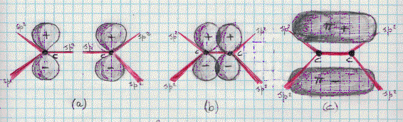 Dalla figura 30 risulta che ciascun carbonio è tetravalente e che ogni carbonio, oltre a legarsi con un legame semplice con un idrogeno, si lega all’altro carbonio con un legame doppio.(4) I due atomi di carbonio possono allora venir separatamente descritti come in figura 31a.. Quando sono avvicinati (figura 31b) originano la struttura di figura 31c. Ed allora, oltre al legame di tipo s , che ha luogo direttamente tra i due atomi di carbonio per sovrapposizione