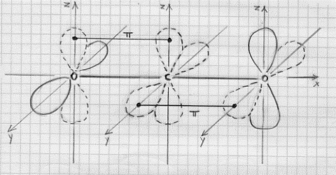 Per costruire la molecola si può pensare che i due ibridi sp del carbonio si leghino, lungo l’asse x, ciascuno con uno degli orbitali 2px dei due atomi di ossigeno (e questo fornisce le scheletro della molecola – mostrato in figura 39 – che, in accordo con i dati sperimentali, è lineare come del resto l’intera molecola). Consideriamo ora questo scheletro che,
