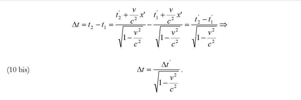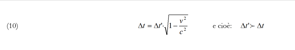 E qui sta la non oziosità di questo breve calcolo. Non bisogna utilizzare la (9) o la (10 bis) per misure effettuate una volta dall’uno e una volta dall’altro riferimento, semplicemente ricavandosi, a partire da una sola delle espressioni suddette, Δt o Δt’, a seconda delle necessità: ciò porterebbe a risultati erronei assegnando un valore assoluto alla dilatazione del tempo (ritorneremo su questo argomento quando ci occuperemo del paradosso dei gemelli).