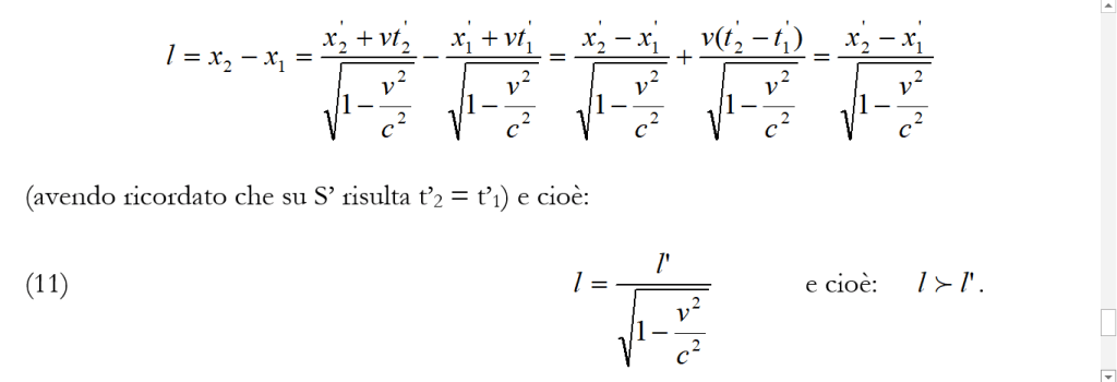 Se i due sistemi fossero in quiete relativa si avrebbe subito ℓ = ℓ’. Ma poiché i due sistemi sono in moto relativo con velocità v, l’osservatore che si trova in S, utilizzando le trasformazioni di Lorentz (8), troverà per l’asta la lunghezza: