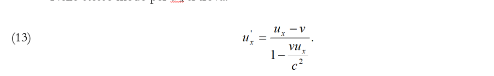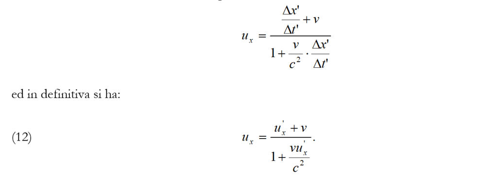 Alla (13) si può anche arrivare, per il principio di relatività ponendo nella (12) al posto di ux, u’x, v, rispettivamente u’x, ux, -v.