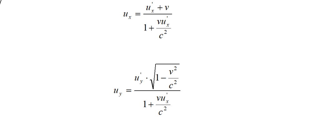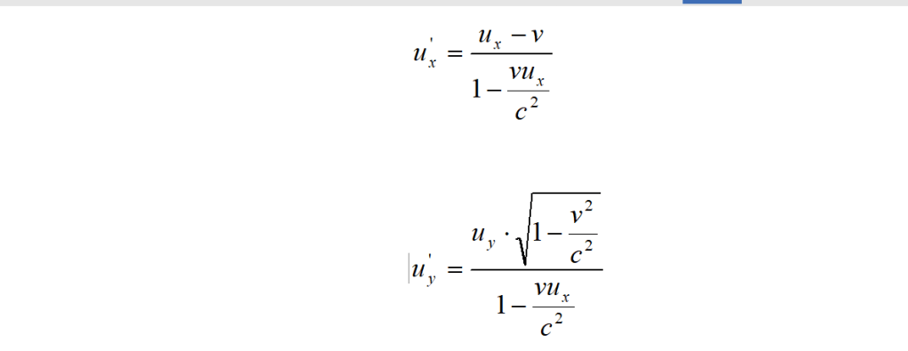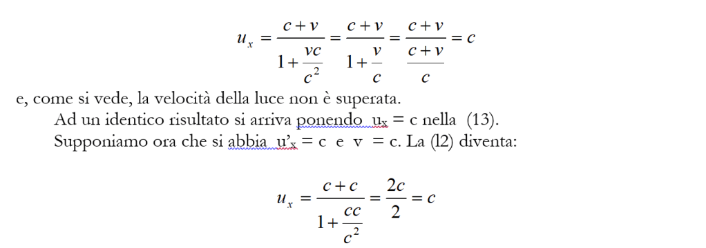 Il risultato è più generale di quanto qui mostrato e, qualunque siano i valori di u’x e v, le equazioni (l2) e (l3) soddisfano il principio di costanza della velocità della luce.