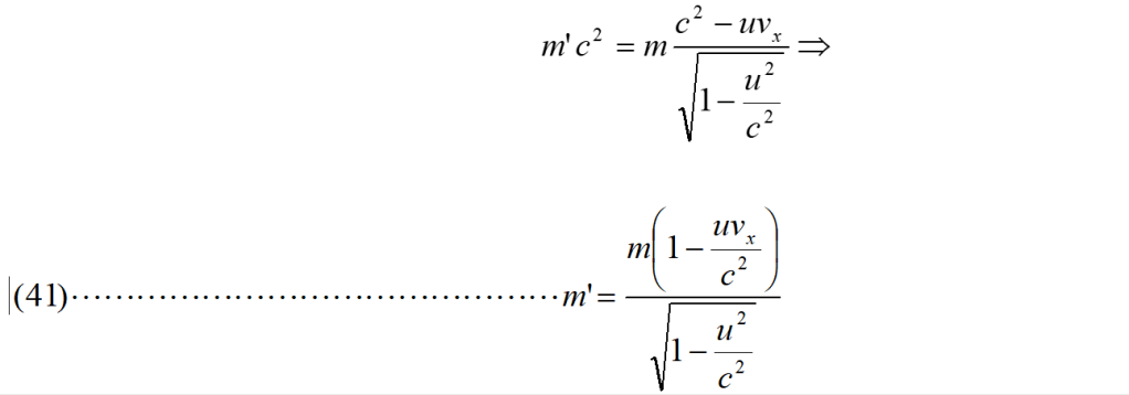 Le equazioni di trasformazione per la massa, sempre rispetto ai riferimenti S ed S’ presi in considerazione nella sezione precedente, si possono ricavare facilmente a partire da uno dei passaggi che abbiamo incontrato per ricavare la (39):