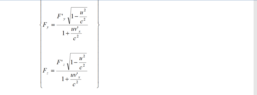 Il problema può allora essere risolto utilizzando le (40). Tenendo conto delle componenti Fx, Fy ed Fz della forza F e ricordando la trasformazione di Lorentz (8) per t’, si ha: