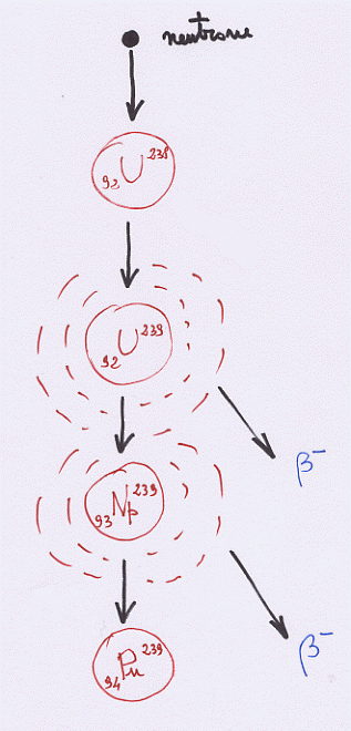 In alcuni reattori (LWR di tipo BWR o PWR: si legga “Reattori ad acqua leggera di tipo acqua bollente o acqua in pressione”) si usa come moderatore l’acqua mentre il combustibile è Uranio arricchito (e l’Uranio va arricchito perché l’acqua, oltre a moderare, assorbe anche dei neutroni). Abbiamo già visto quali sono i processi di fissione ce avvengono in questi reattori e che interessano l’Uranio 235. Vediamo ora cosa accade, parallelamente, all’Uranio 238 presente in gran quantità nel combustibile in uso. Quando un nucleo di Uranio 238 viene colpito da un neutrone si origina Uranio 239 che, essendo molto instabile, decade subito emettendo una radiazione b–, in Nettunio 239; anche quest’ultimo è un elemento molto instabile che, emettendo ancora una particella b–, decade in Plutonio 239. La reazione descritta è la seguente: