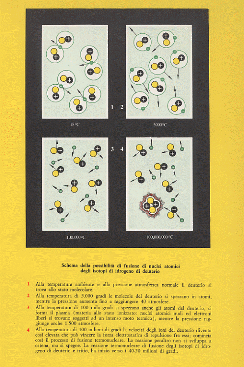 Accennerò appena a questo tipo di reazione nucleare: essa è ancora allo studio e non ancora in grado di fornire energia utilizzabile per scopi pacifici. L’unico uso pratico e realizzato dall’uomo di reazioni di fusione è quello della bomba all’idrogeno o bomba H. Viceversa, dalla fusione dipende la vita del nostro sistema solare e, in particolare, della Terra: sono reazioni di fusione nucleare che avvengono (a centinaia di migliaia) sul Sole che ci permettono fornendo l’energia necessaria al ciclo delle acque, alla fotosintesi ed a tutti i processi vitali.