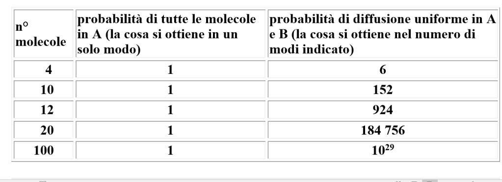 La probabilità dello stato di ugual densità è dunque sei volte maggiore di quello con tutte e quattro le molecole in A. Nella tabella scritta sopra si riportano le probabilità dei due stati per qualche altro numero di molecole abbastanza piccolo. Poiché esiste un numerò enorme di modi di distribuire N particelle (dove N è il numero di Avogadro) in modo che metà si trovino in A e metà in B, ma un solo modo di trovarle tutte in A, diventa chiaro cosa vuol dire che una trasformazione è irreversibile: significa che essa procede da uno stato meno probabile a uno stato molto più probabile.