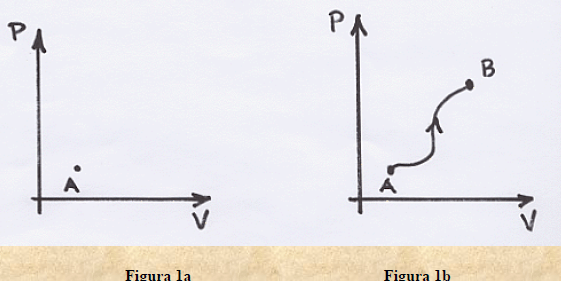 Supponiamo di avere un piano P,V (pressione, volume) e di fissare una data temperatura T. Un punto A su questo piano rappresenta un sistema termodinamico in equilibrio (Fig. 1a) ed un sistema è in equilibrio termodinamico quando i valori delle variabili termodiamiche (P, V, T) non variano nel tempo. Supponiamo ora che questo sistema si sposti dall’equilibrio (facendo variare P e V) fino ad arrivare ad un punto B