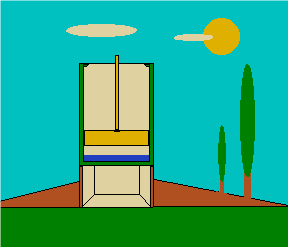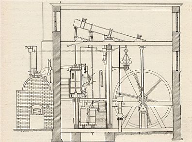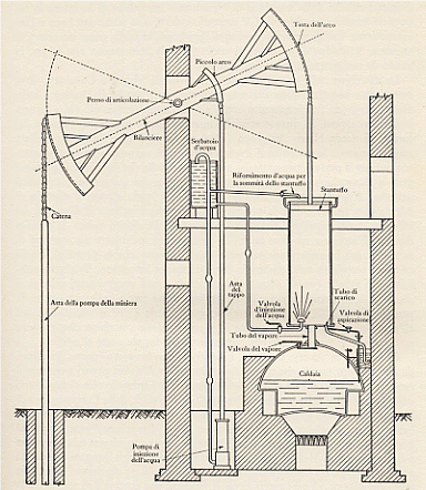 Riporto uno schema di una pompa idraulica per rendersi rapidamente conto del suo funzionamento. Una macchina a vapore doveva azionare la leva di una tal pompa con continuità, sollevando l’acqua alla superficie del suolo.