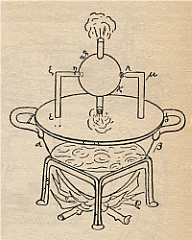 Molti sono i dispositivi meccanici di cui ci parla Erone nella Pneumatica e negli Automata. Dispositivi che permettono le aperture automatiche delle porte di piccoli templi, idranti, organi ad acqua, teatro degli automi, … Per realizzare i quali vi è l’elaborazione di una quantità di concetti che riguardano l’energia dell’aria compressa e riscaldata, del vapore; l’uso di valvole, stantuffi, sifoni, ruote dentate, carrucole. Di interesse per noi è l’eolipila, uno strumento di divertimento che utilizza il vapore che produce movimento meccanico di rotazione. La Fig. 7 rappresenta l’eolipila. La sfera in