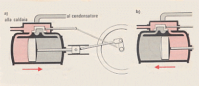 faccia e poi sull’altra del pistone nel cilindro. Riferendoci alla figura, si vede chiaramente il percorso del vapore: in (a) il vapore proveniente dalla caldaia spinge il pistone verso destra; nel far questo sposta anche quel piccolo pezzo (a forma di U rovesciata) che va a chiudere il passaggio proprio a questo vapore e ad aprire la possibilità per esso di entrare dall’altra parte, come mostrato in (b). La cosa si ripete ad ogni spostamento del pistone.
