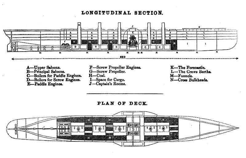 Anche sulla Great Eastern si dovette affrontare il problema della distanza verticale tra l’asse della macchina a vapore e la posizione della ruota a pale. Il problema venne qui risolto mediante l’oscillazione dei 4 cilindri. Ciascun cilindro aveva un diametro di poco meno di due metri ed una corsa di oltre 4 metri per una potenza complessiva di 3410 cavalli che muoveva ruote a pale di un diametro di 17 metri ad una velocità di circa 11 giri al minuto (oltre all’elica) e ad una velocità della nave di 15 nodi.