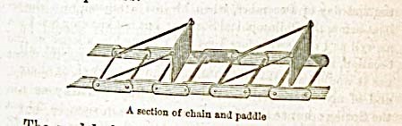 Il primo battello di Fitch del 1785 come risulta disegnato per l’American Philosophical Society. Una catena a cui erano collegate delle pale (vedi figura seguente) era messa in rotazione dal vapore e spingeva il battello.
