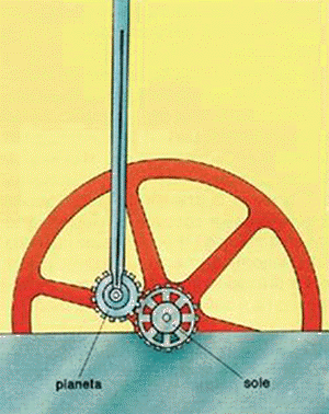 Uno schema di macchina di Watt del 1781. Dalla caldaia (1) il vapore entra nel cilindro (2) facendo muovere il pistone che ha l’asta collegata al bilanciere (3). Il movimento di quest’ultimo fa muovere l’altra asta collegata alle due ruote dentate (rotismo o differenziale 4) che a loro volta trasferiscono il moto alla ruota più grande. Nel rotismo satellitare la ruota satellite, rigidamente fissata alla biella, si muoveva lungo il perimetro della ruota centrale che era inchiavettata all’albero. Il sistema del rotismo fu sostituito nel 1784 da un sistema a manovella. Osservo che questa macchina era già a doppio effetto, il vapore entrava cioè una volta nella parte inferiore del cilindro spingendolo in alto ed una volta dalla parte superiore del cilindro spingendolo in basso (la distribuzione del vapore avveniva mediante un cassetto di distribuzione).