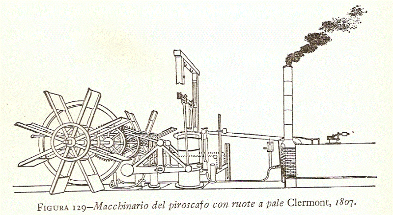 Prima di seguire oltre occorre fare qualche osservazione. L’applicazione del vapore su macchine fisse per lavori a terra non creava problemi di alcun tipo. Quando si pensò di utilizzare la macchina a vapore per la navigazione si posero immediatamente problemi gravi. Intanto le prime macchine a vapore erano molto ma molto pesanti e, prima che scadesse il brevetto di Watt (era del 1769 e scadeva nel 1775 ma vi fu una proroga del Parlamento inglese al 1800), fu estremamente difficile realizzare un battello a vapore per gli alti costi di una grande macchina che, in più, occupava, con in più il combustibile, gran parte dello spazio utile della nave. Vi era dell’altro ed era relativo alla necessità di mantenere il baricentro del battello molto basso (ad evitare il ribaltamento) e le macchine a vapore precedenti a Watt avevano un bilanciere in alto molto pesante (queste ultime risultarono invece molto utili in fiumi dove si necessitava un piccolo pescaggio e ebbero successo soprattutto negli USA per la navigazione sull’Hudson e sul Mississipi). Vennero sviluppate della macchine a vapore in grado di superare la difficoltà del pesante bilanciere situato in alto, le macchine “a bilancieri laterali” che migliorarono la stabilità della nave, ne aumentarono il pescaggio permettendone l’uso in mare aperto (vedi più oltre le ultime due figure dedicate alla nave Clermont). Vi è un’ultima considerazione da fare, il combustibile (carbone) ed il suo consumo. E’ evidente che il carbone richiedeva molto spazio per essere stivato ma il problema era di poco conto quando i battelli erano utilizzati in corsi fluviali o bordeggiando la costa. Vi erano dei luoghi dove ci si poteva rifornire durante il tragitto. E’ altrettanto evidente che il problema diventava esiziale quando si fosse viaggiato in mare aperto in traversate transoceaniche. Come ricordano Derry e Williams il problema si pose con forza con la nave transoceanica Great Eastern(2). Si può allora capire con quale difficoltà lavorarono coloro che lavorarono su battelli a vapore prima del 1800 e, nel contempo, si può osservare che i battelli a vapore economicamente utilizzabili furono realizzati dopo il 1800 con l’introduzione della macchina di Watt molto più piccola (nelle ultime versioni) di quella, ad esempio, di Newcomen e molto più versatile.