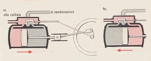 Cassetto di distribuzione. Riferendoci alla figura, si vede chiaramente il percorso del vapore: in (a) il vapore proveniente dalla caldaia spinge il pistone verso destra; nel far questo sposta anche quel piccolo pezzo (a forma di U rovesciata) che va a chiudere il passaggio proprio a questo vapore e ad aprire la possibilità per esso di entrare dall’altra parte, come mostrato in (b). La cosa si ripete ad ogni spostamento del pistone.