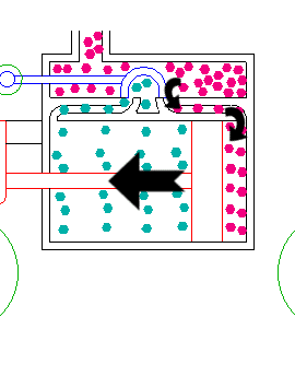 Cassetto di distribuzione del vapore. Riferendoci alla figura, si vede chiaramente il percorso del vapore: in (a) il vapore proveniente dalla caldaia spinge il pistone verso destra; nel far questo sposta anche quel piccolo pezzo (a forma di U rovesciata) che va a chiudere il passaggio proprio a questo vapore e ad aprire la possibilità per esso di entrare dall’altra parte, come mostrato in (b). La cosa si ripete ad ogni spostamento del pistone.
