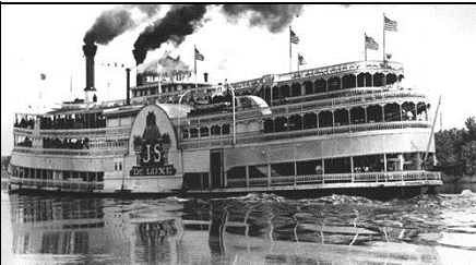 Una delle classiche navi (showboat), la J.S. De Luxe (seconda metà Ottocento), mossa con la ruota a pale laterale lungo il Mississipi