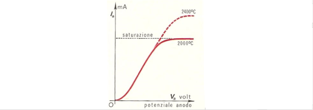 Le leggi dell’emissione di elettroni da parte del catodo (emissione termoelettronica) sono quelle stabilite da Richardson. La corrente che si genera, diretta dal catodo all’anodo (corrente anodica Ia), è unidirezionale e presenta il fenomeno della saturazione: per una data temperatura del filamento, la corrente anodica cresce con l’aumentare della tensione anodica Va ma fino ad un dato limite, superato il quale ogni aumento di Va lascia praticamente costante l’intensità di corrente. Si dice allora che si è raggiunta l’intensità di saturazione Isat la quale dipende dalla temperatura assoluta del filamento (ed anche dalla sua natura) e cresce con essa.