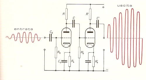 Il filamento, reso incandescente, scalda il catodo che emette elettroni. Questi, per raggiungere l’anodo che supponiamo ad un potenziale Va (positivo rispetto al catodo), devono passare attraverso la griglia. Se portiamo la griglia ad un potenziale Vg (riferito anch’esso a quello del catodo), il numero di elettroni che arriva all’anodo (l’intensità cioè della corrente anodica Ia), dipende sia da Vg che da Va. Variando Vg opportunamente si può regolare il flusso di elettroni tra catodo ed anodo. Se, per ipotesi, Vg è nulla, allora la griglia è come se non ci fosse. Se la griglia è a potenziale negativo (riceve una corrente di elettroni dall’esterno), essi respingono gli elettroni provenienti dal catodo, riducendo l’intensità Ia. Se la griglia è a potenziale positivo (gli viene sottratta una corrente di elettroni), aumenta la corrente Ia. Queste operazioni sulla griglia si possono fare in laboratorio per misurare i vari effetti ma, nella pratica sono le oscillazioni elettromagnetiche provenienti da un’antenna che alimentano la griglia originando una variazione della corrente nel triodo molto più intensa di quella che alimenta la griglia. Si rifletta ora su quanto sto per dire. Se la corrente variabile in uscita da questo triodo (primo triodo) la utilizziamo per alimentare la griglia di un secondo triodo, l’effetto di aumento della corrente Ia nel secondo triodo sarà ancora maggiore. E questo processo può essere ripetuto quante volte si vuole senza perdere le caratteristiche delle oscillazioni d’ingresso ma solo amplificandole.