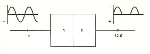 Un diodo utilizzato come raddrizzatore. L’alimentazione è l’onda in arrivo a sinistra ad alta frequenza. Tale onda viene trasformata ed inviata al diodo. Il diodo taglia i semiperiodi negativi (rispetto al catodo) dell’onda fornendo un segnale in uscita che è unidirezionale. La resistenza R rappresenta il circuito in cui viene utilizzato il segnale raddrizzato.