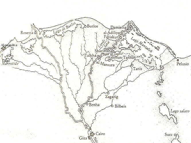 Passarono cinque settimane ed ancora non si aveva notizia della partenza di Federico.Luigi era impaziente e con Pelagio decise che era ora di attaccare, prima delle inondazioni del Nilo e prima che terminassero le risorse economiche di Pelagio che ormai erano agli sgoccioli. Da queste argomentazioni i capi crociati si lasciarono convincere chiedendo solo di convocare Giovanni. Da Cipro arrivavano notizie di un grande esercito che al-Muazzam stava mettendo insieme e questo fu un altro motivo ve spingeva Pelagio ad attaccare subito anche perché stava per scadere il temine che nell’Apocalisse si dava alla Bestia, naturalmente musulmana (i famosi 666 anni dalla nascita di Maometto).