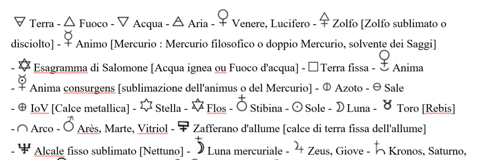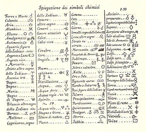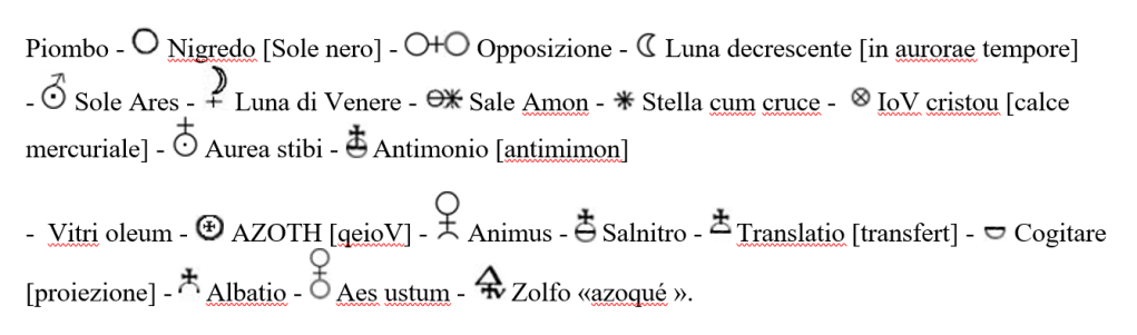 Riporto di seguito l’elenco di vari simboli alchemici perché indicativamente aiutino a capire alcune immagini: