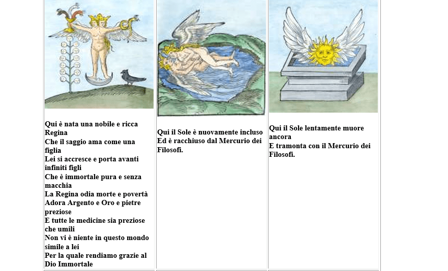 “… nostro portinaio, nostro balsamo, nostro miele, olio, rugiada di maggio, madre, uovo, segreta fornace, fuoco vero, dragone velenoso, vino ardente, leone verde, uccello di Ermete, oca di Ermogene, spade affilate in mano al cherubino che custodisce l’Albero della Vita … è la nostra verità, il vaso segreto, il giardino dei Saggi nel quale il Sole sorge e tramonta”.