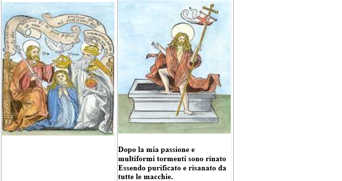 La figura 7 (che nell’ogiva è disposta sotto la 18) rappresenta, su campo verde, due uomini ed una donna che risorgono purificati da un bagno e vestiti di biano. Il fondo è verde perché a questo punto dell’opera la materia è verde. I tre personaggi che risorgono rappresentano il Corpo, l’Anima e lo Spirito della nostra Pietra Bianca. E così come Corpo, Anima e Spirito formano un uomo solo, vi è una sola Pietra Bianca che ha le caratteristiche cercate (e qui vi sono tante cose che si potrebbero dire ma solo a quelli di animo puro e veri credenti, i cosiddetti iniziati). La simbologia prevede la resurrezione di Sole, Luna e Mercurio. Levando la testa in alto si vede (fig. 18) venire il re coronato e resuscitato (che ha vinto la morte) sorretto da due angeli. E’ l’elisir bianco che da questo momento unirà a sé inseparabilmente ogni natura metallica pura tramutandola nella sua natura argentata e raffinata e scacciando l’impurezza e l’eterogeneità. Lodato sia Dio per questo regalo e per poter considerare questo bianco scintillante, più perfetto di ogni altra cosa dopo l’anima immortale; lodato sia per la Quintessenza, un Argento purissimo passato nel crogiolo e raffinato sette volte (dice il Profeta David).